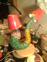 Luego empecé a hacer pruebas para conseguir que la lámpara se sostuviese sobre una pequeña superficie. Tras muchos intentos utilizando tornillos, alambre, etc. conseguí gracias a un tubito de madera lo que quería. Bicéfalamp se levantaba por primera vez, aunque aun había que vestirla de rojo :P
